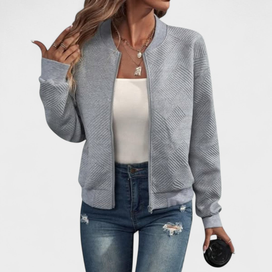 Dora bomberjakk toob klassikalisele ajatu stiilile kaasaegse puudutuse. Peene geomeetrilise mustriga, praktilise lukuga ja ribadega mansettidega, mis tagavad ideaalse sobivuse, on see kerge ja ideaalne igasuguste riietustega – alates teksadest kuni kleitideni – igal aastaajal.